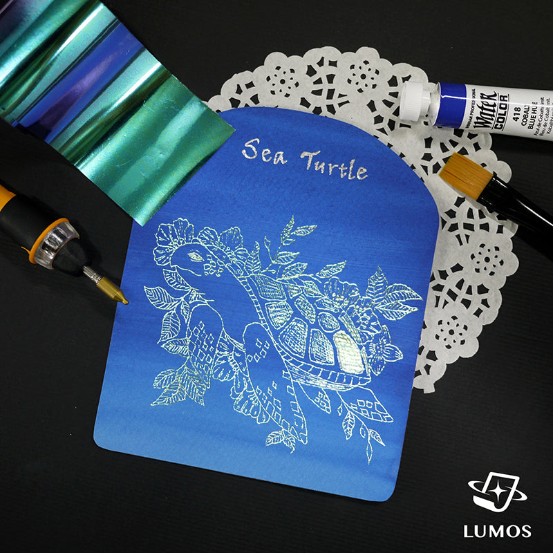 將燙金箔平放至需燙印的紙張上方後⇒ 以"紙膠帶"四邊固定燙金箔⇒ 加熱燙金筆⇒